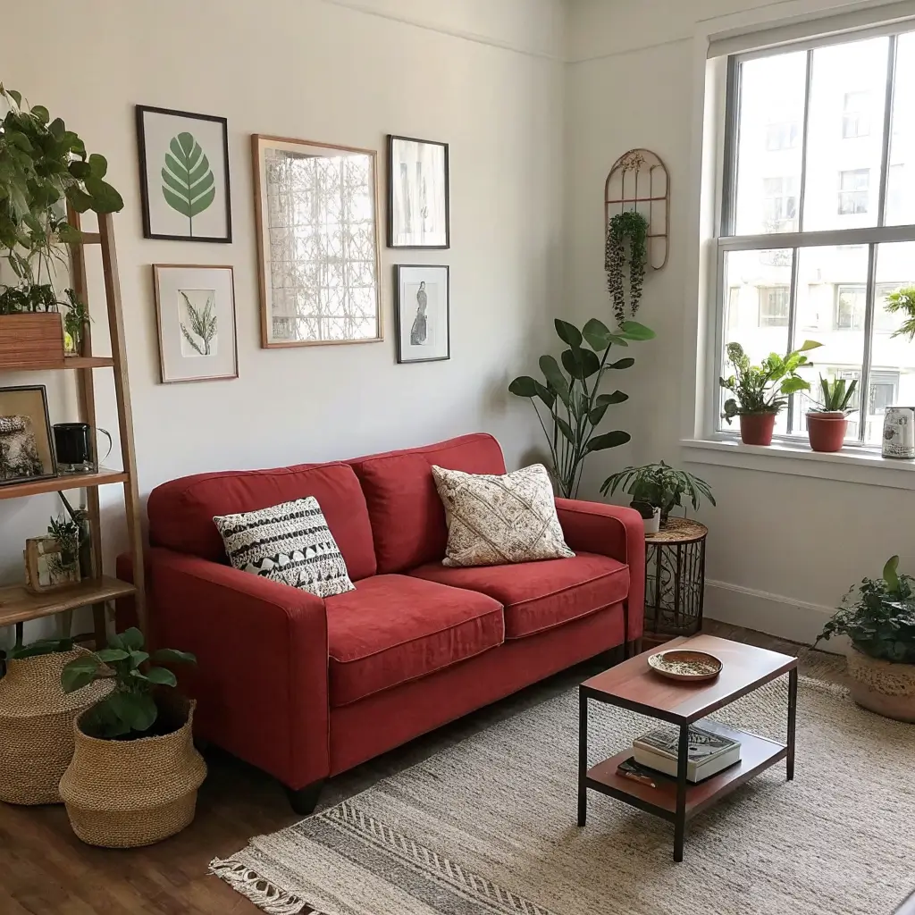 Create a plant corner near your red couch with different heights and textures. Mix trailing pothos with upright snake plants. Add a fiddle leaf fig for height. Throw in some small succulents on the side table. Before you know it, you’ve got your own urban jungle.