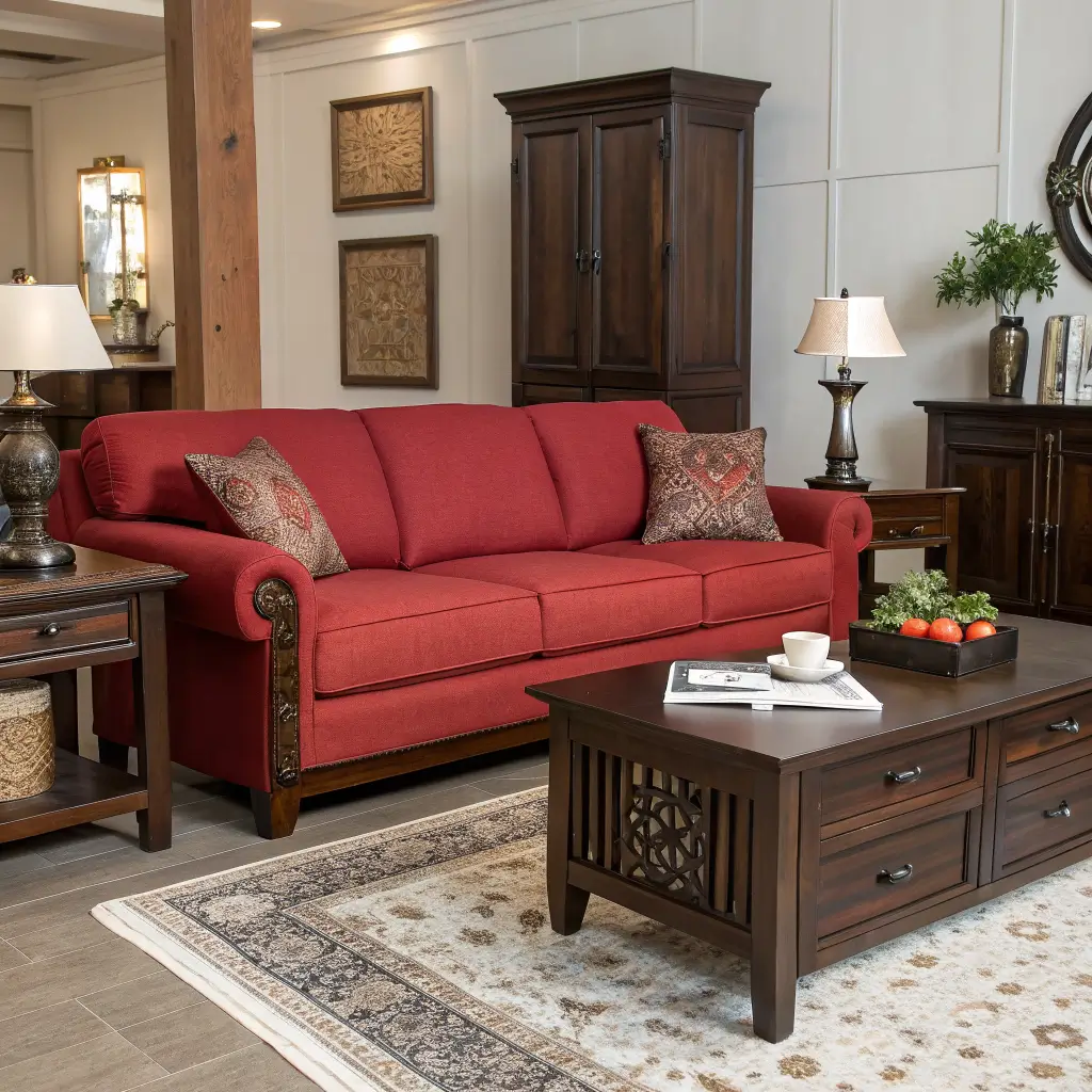 Red Couch and Dark Wood Furniture Combo