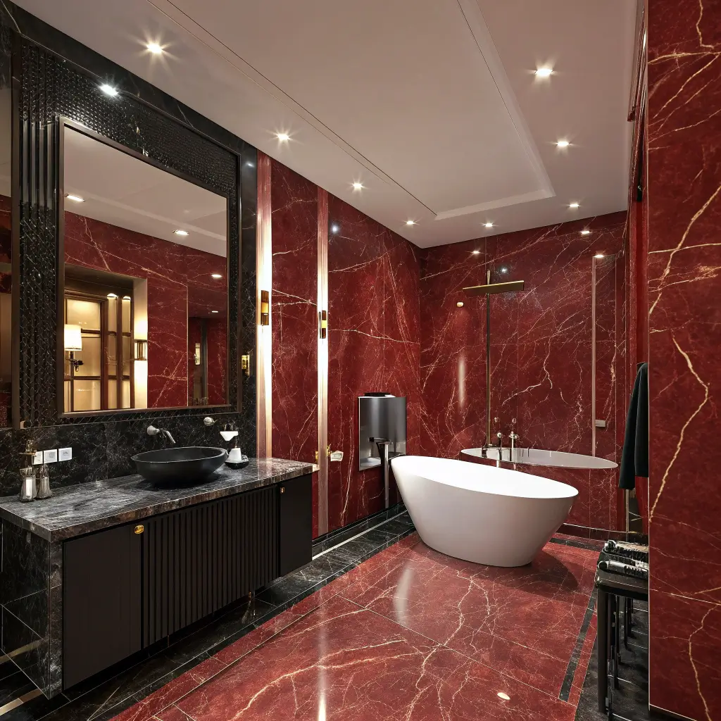 Want to go full glamour? A high-gloss polished red marble bathroom is about as luxurious as it gets. I’m talking mirror-like surfaces that reflect light and create this incredible sense of space and opulence. Walking into one of these bathrooms feels like stepping into a five-star hotel.