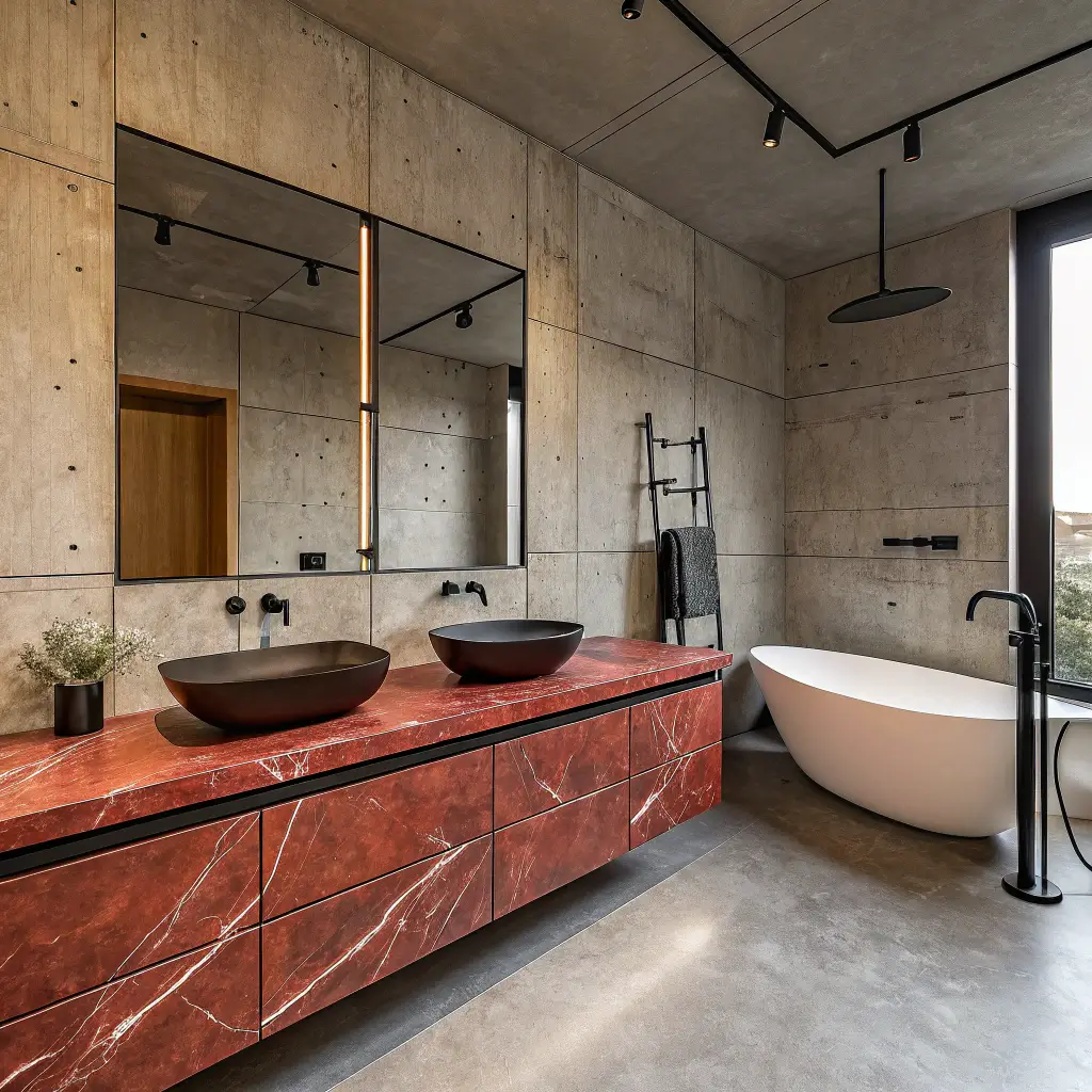 I first saw this combination in a converted loft bathroom, and it stopped me in my tracks. The designer had used polished concrete for the floors and walls, then added a stunning red marble vanity and shower bench. The contrast between rough and refined was absolutely brilliant.