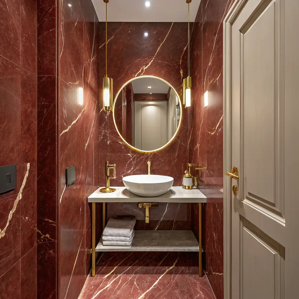 Powder rooms are the perfect place to go bold with red marble. Since guests use these spaces briefly, you can create dramatic impact without worrying about it being too much for daily living. This is your chance to show off!