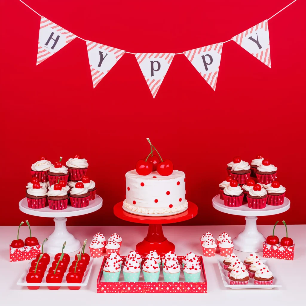 cherry-themed dessert table is where you can really let your creativity shine. Cherries are naturally red, delicious, and they photograph beautifully – it’s like they were made for party themes!
