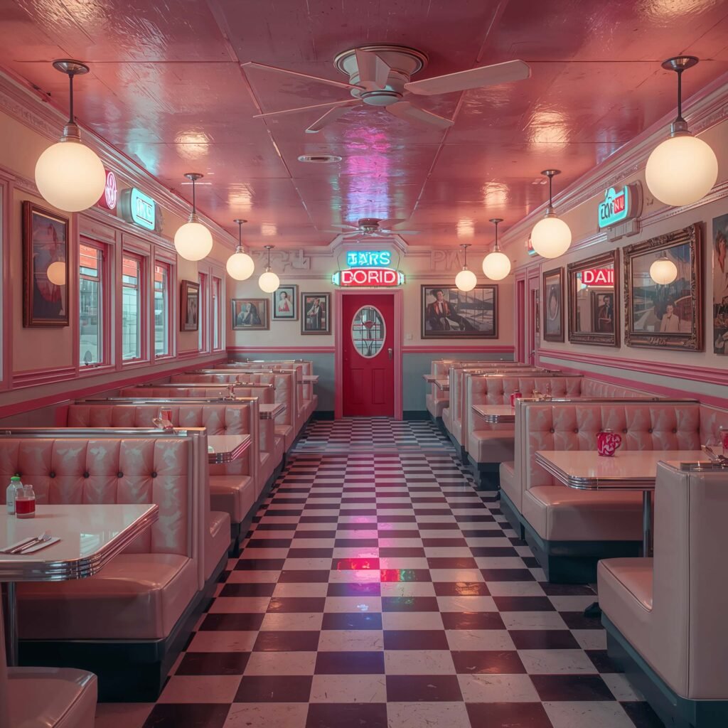 • 1950s: Checkered floors, vinyl booths, neon signs, chrome details
