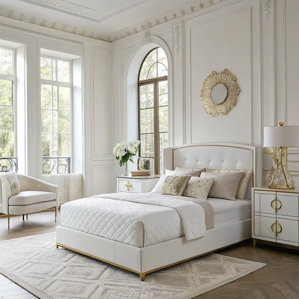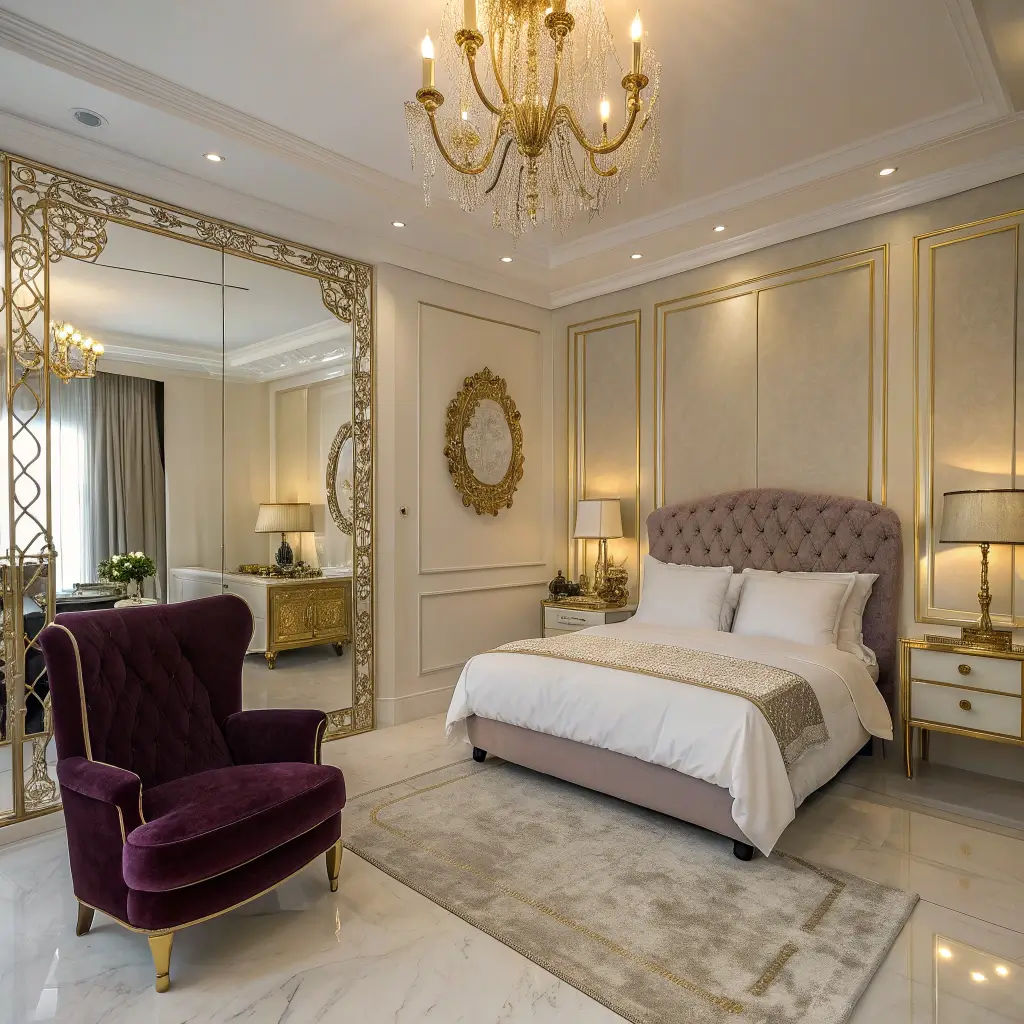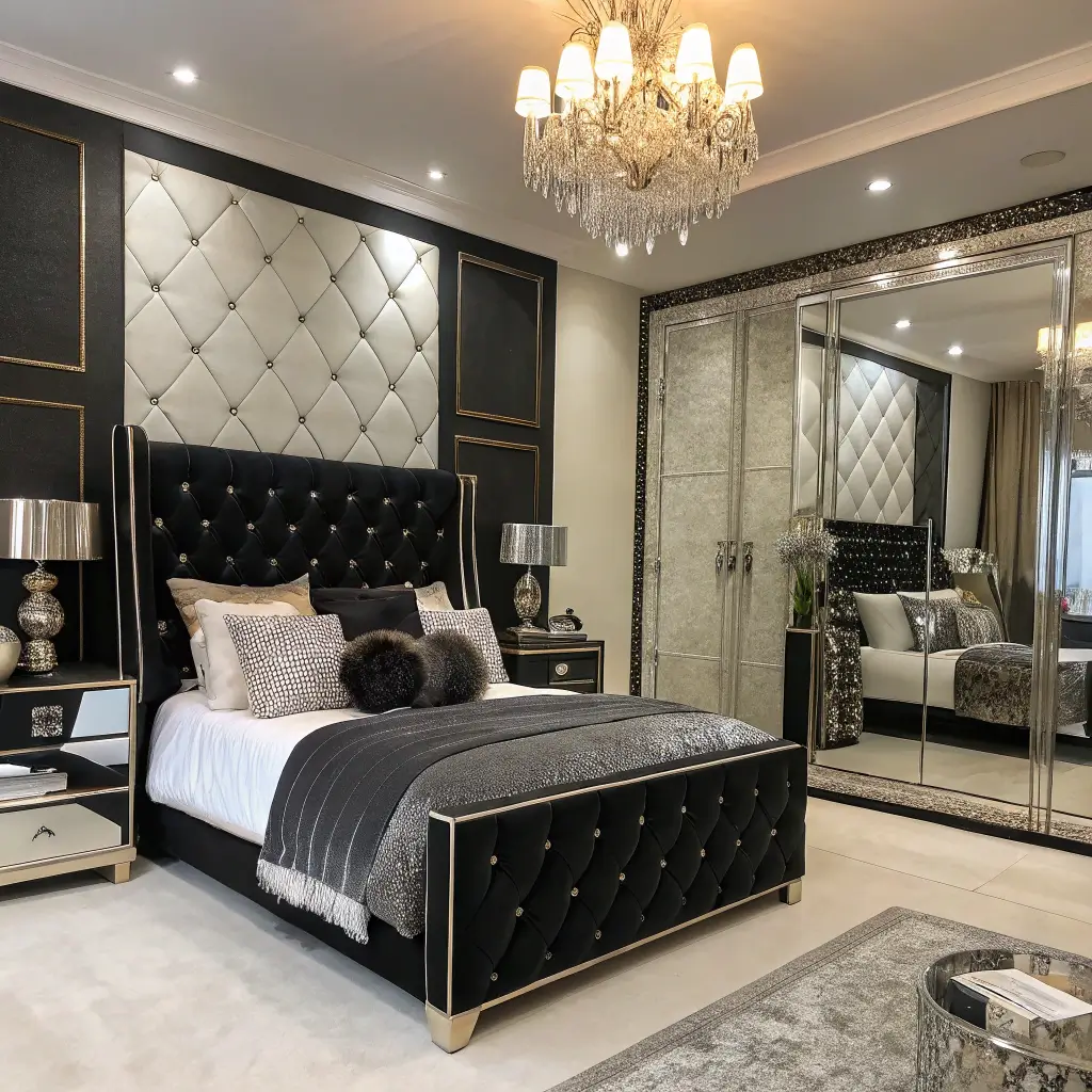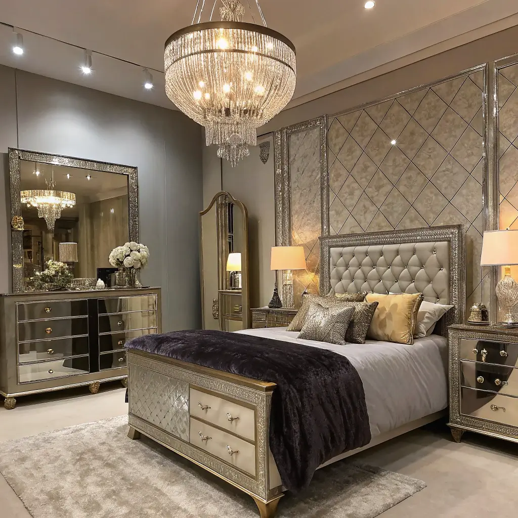 Channel your inner starlet with a bedroom that looks like it belongs in a Beverly Hills mansion. Think mirrors everywhere, metallic finishes, and furniture with curves in all the right places. This isn’t subtle – it’s meant to make a statement.