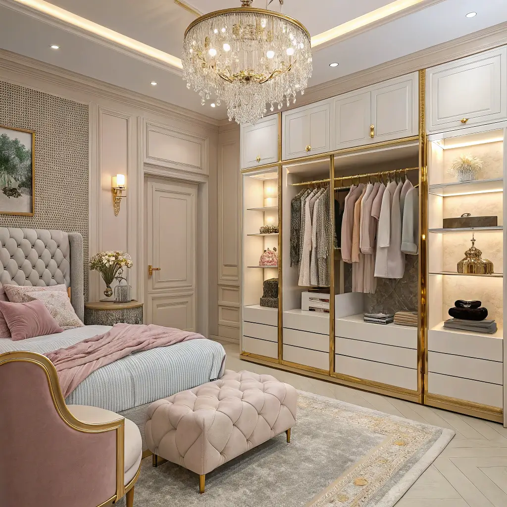 Why hide your designer pieces when you can make them part of your bedroom decor? The integrated walk-in closet bedroom is peak rich girl energy. We’re talking glass doors, LED lighting, and your wardrobe displayed like it’s in a boutique.