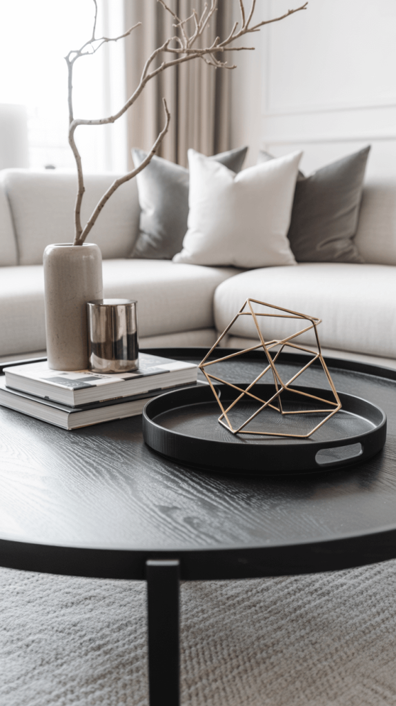 - Keep it Monochromatic: Choose a color story and stick to it. All black and white. Shades of grey. Cream and beige. This creates a seamless, curated look that feels expensive and intentional. A black tray, a white art book, and a black candle is a classic combo that just works.