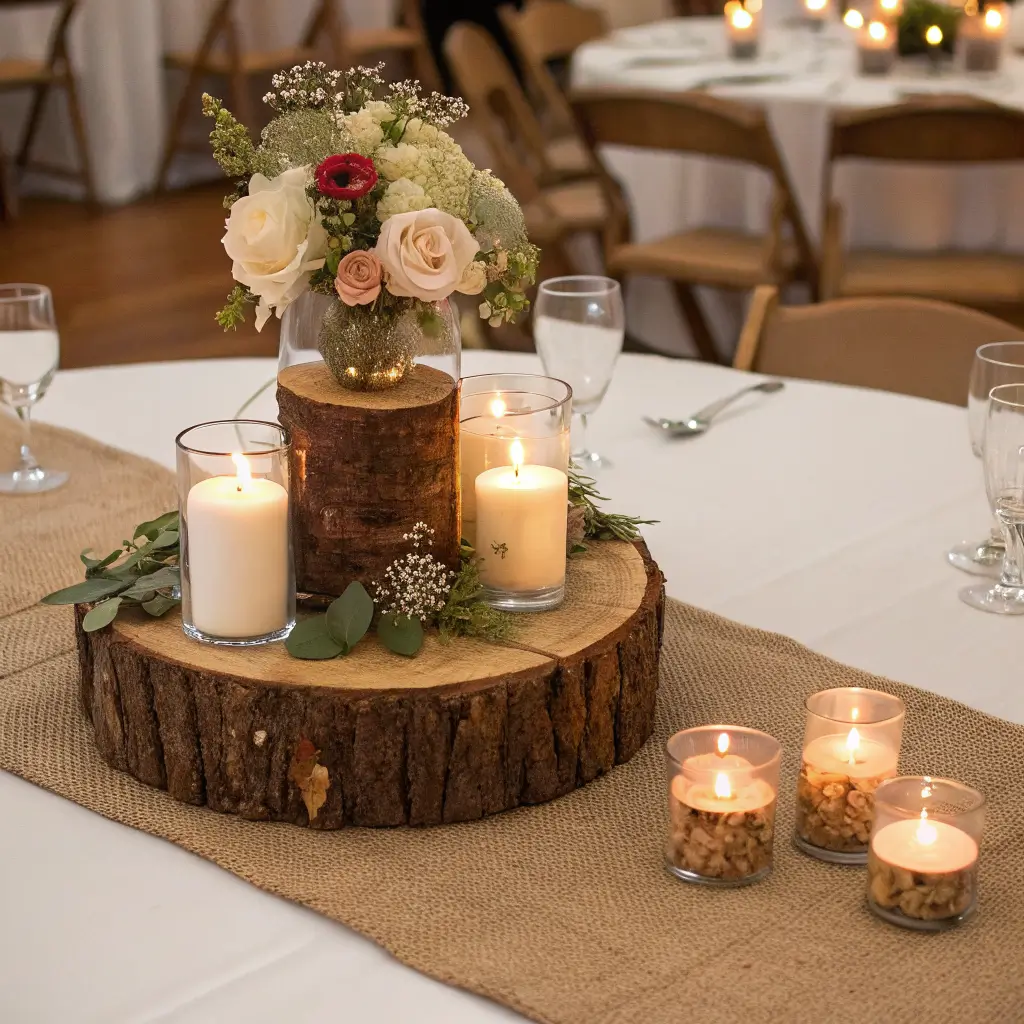 Start with a wooden slice as your base – you know those cross-sections of tree trunks that look like they came straight from a lumberjack’s workshop? Place that bad boy right in the center of your round table. I’ve found that slices between 12-16 inches work perfectly for standard round tables without overwhelming the space.