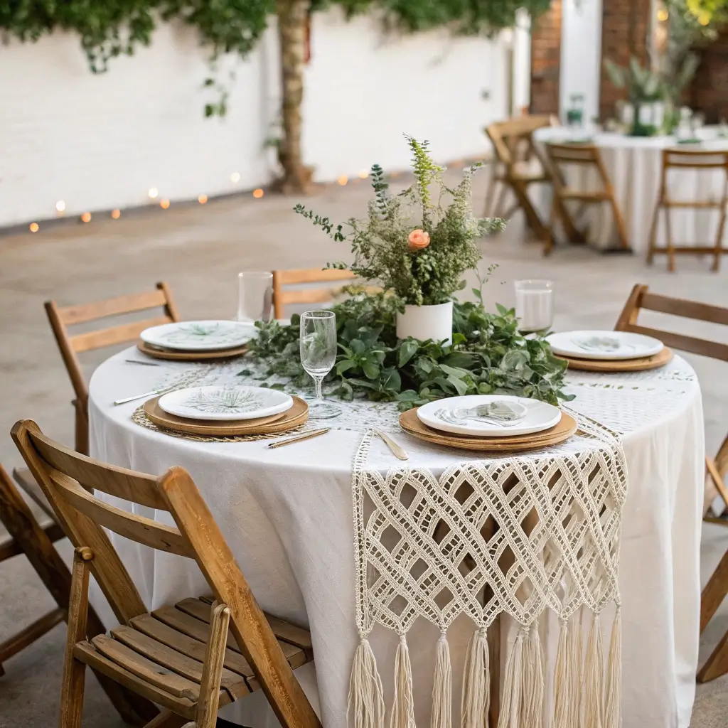 Start with a macrame table runner – yes, they make those specifically for round tables now. The circular patterns work beautifully with the table shape. Layer this with an abundance of greenery. And when I say abundance, I mean go wild.