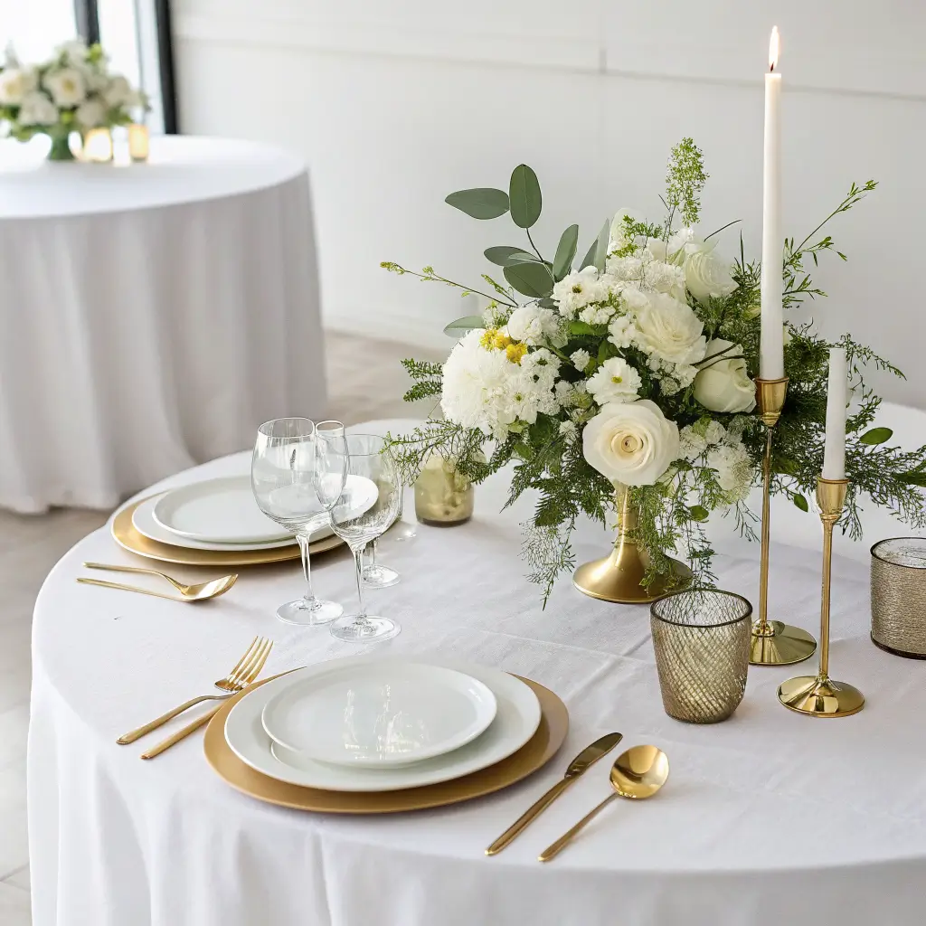 The gold accents should be subtle but strategic. Think gold-rimmed chargers, delicate gold votives, and maybe gold calligraphy on the place cards. The key word here is restraint.
