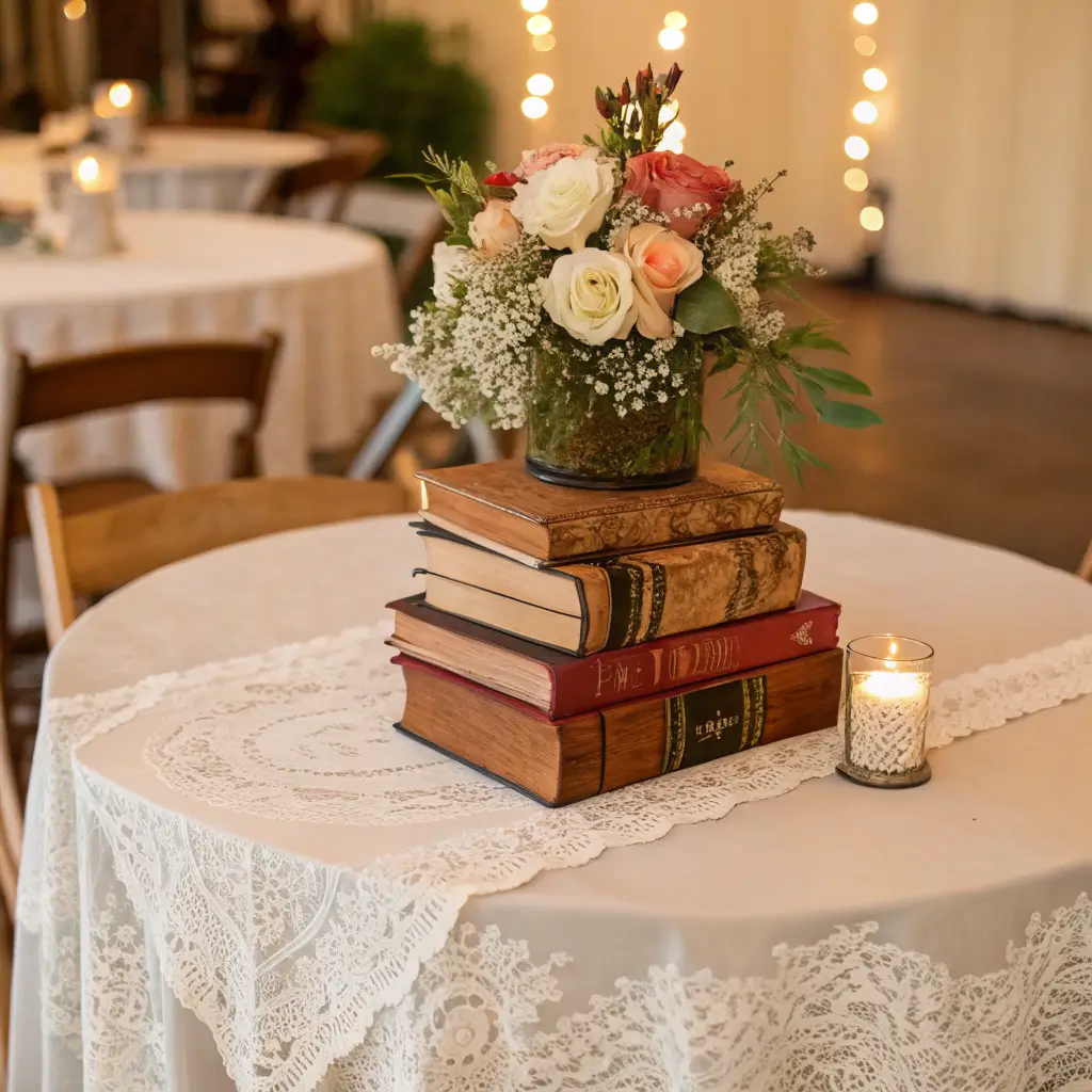 Top each stack with a small floral arrangement in a vintage teacup or small mason jar. The contrast between the old books and fresh flowers? Chef’s kiss. You can even tie the book stacks with vintage lace or ribbon for extra charm.