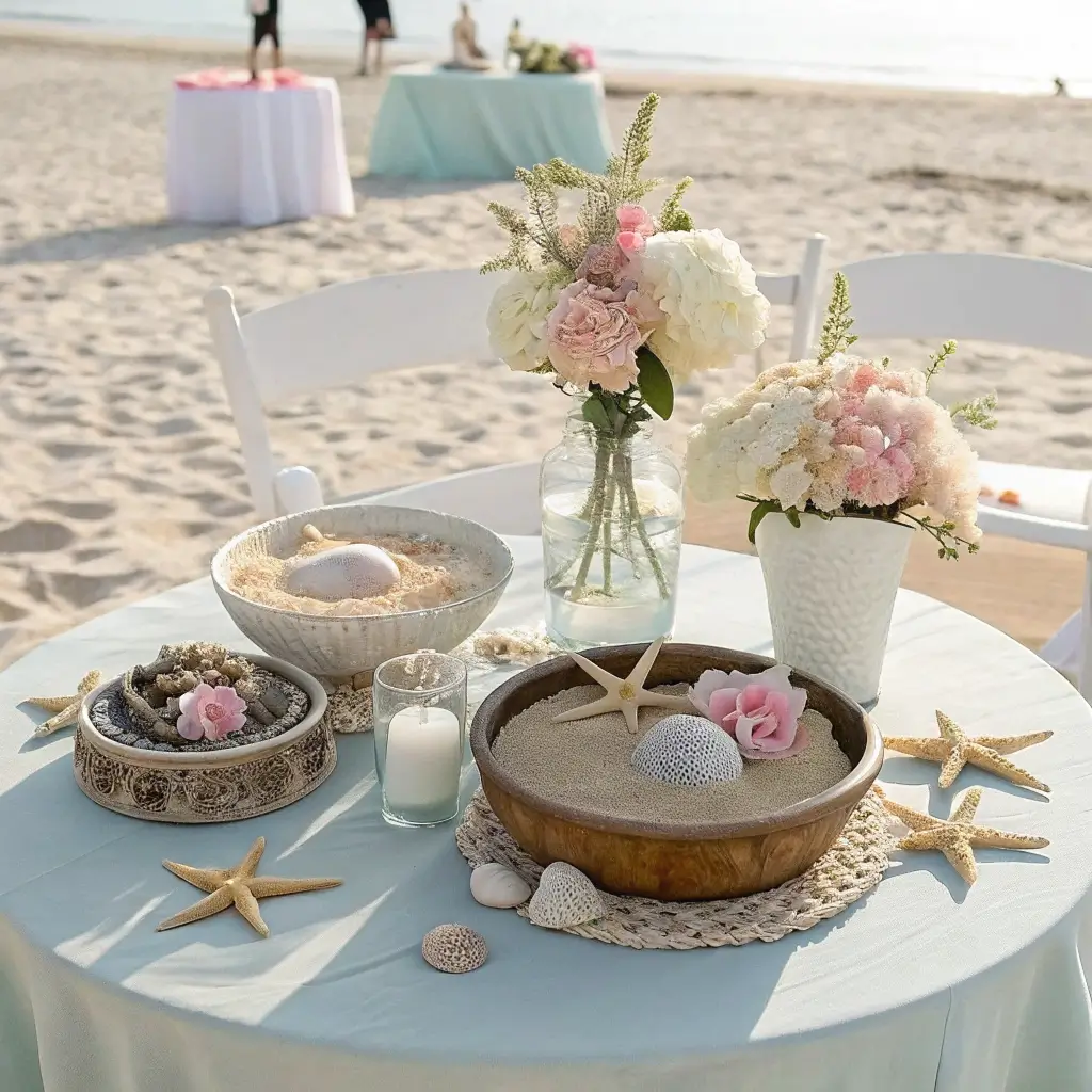 Start with a large glass bowl or hurricane vase as your centerpiece base. Fill it partially with sand (yes, actual sand – you can buy it clean and sanitized). Layer in shells, starfish, and maybe some sea glass. Pop a pillar candle right in the center.