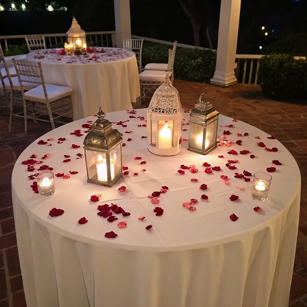 Want to create that swoony, romantic atmosphere that makes everyone believe in love again? Lanterns and rose petals are your secret weapons. This combo works year-round and fits almost any wedding style.