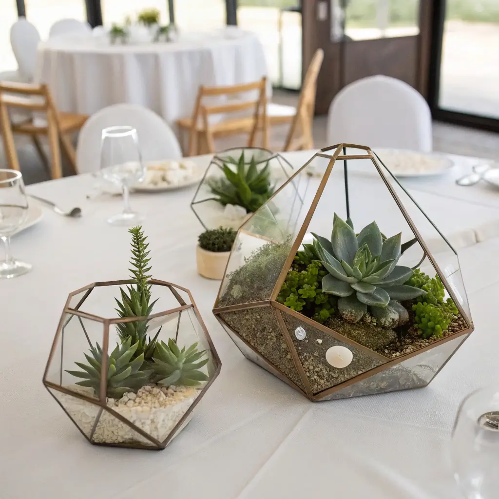 For couples who love that clean, contemporary aesthetic, geometric terrariums are having a serious moment. They’re modern art meets living garden, and they work incredibly well on round tables.