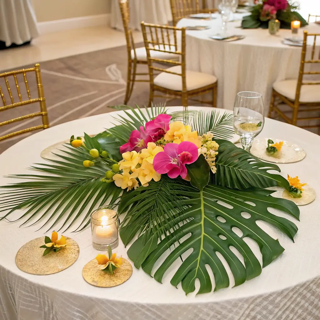 Let’s end with something bold and unexpected. Tropical centerpieces on round tables create these amazing micro-paradises where guests feel like they’re dining in an upscale Hawaiian resort.