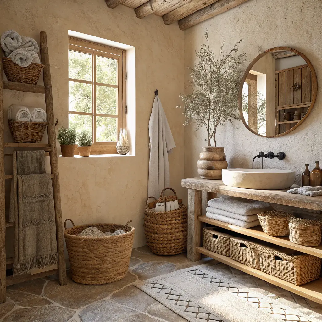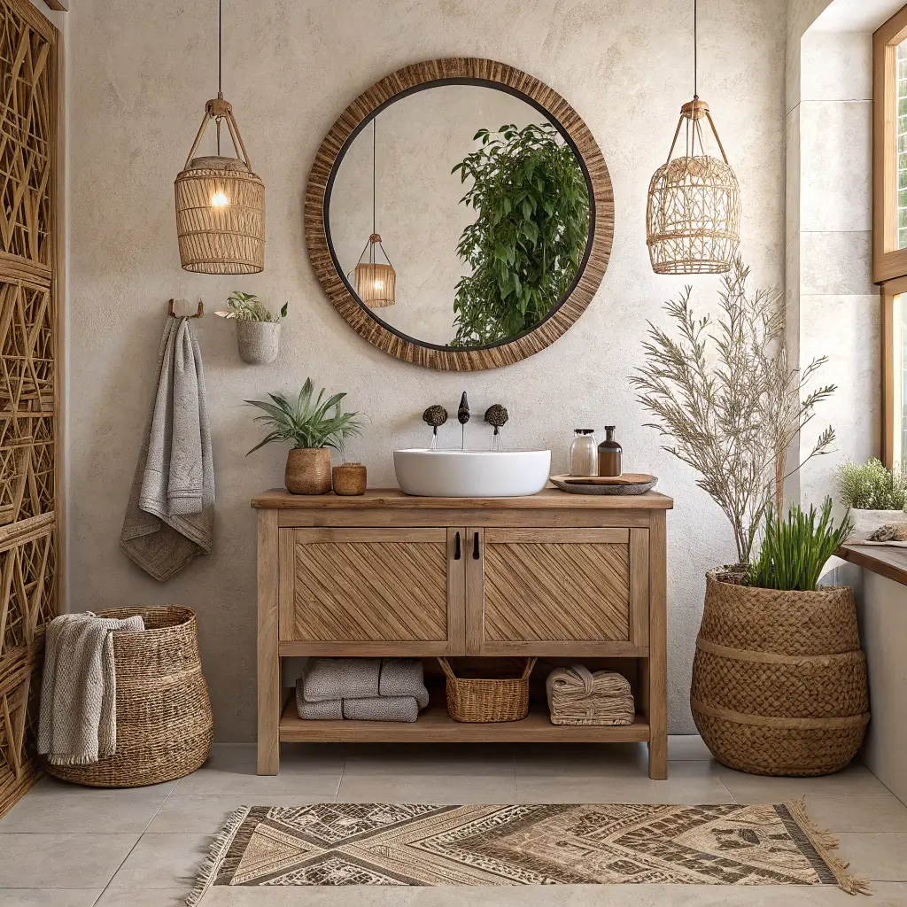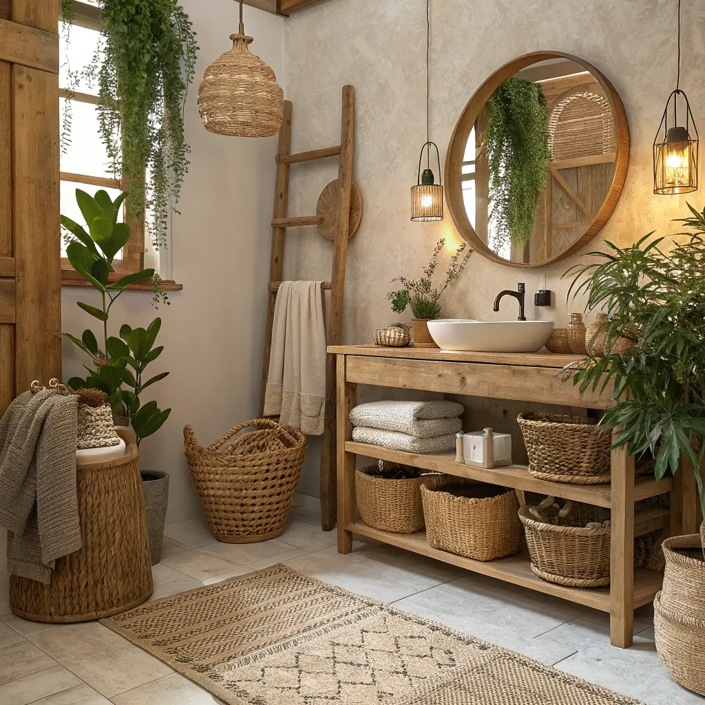 Let’s start with the foundation of every great rustic boho bathroom โ the pairing of raw, earthy wood with woven decor elements. This combination forms the DNA of the entire aesthetic, and once you nail it, everything else falls into place.