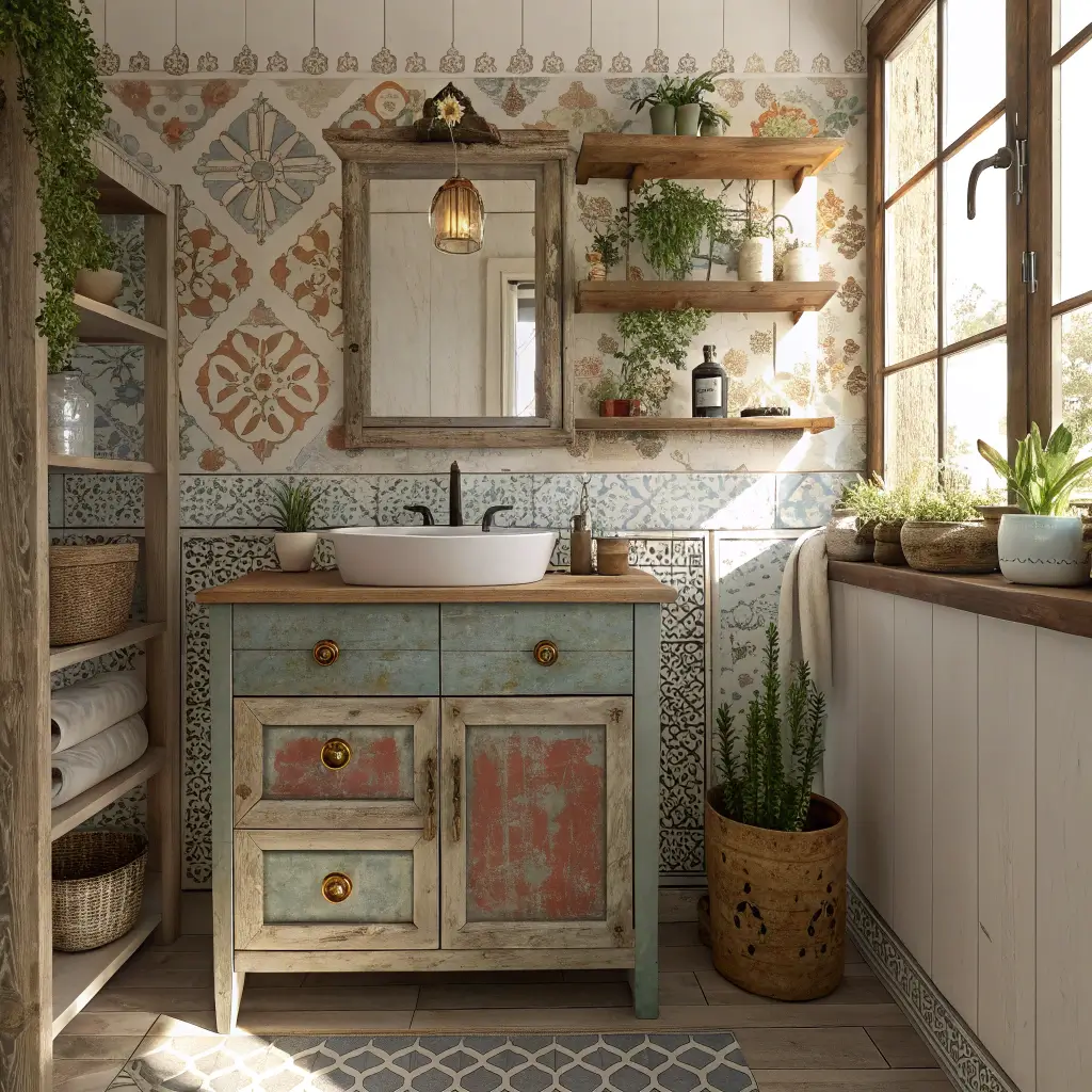 Moroccan-inspired patterns, Mexican Talavera designs, and folk-art motifs all work beautifully in rustic boho bathrooms. The slightly imperfect, handmade quality of each tile aligns perfectly with the boho philosophy of embracing individuality over uniformity.