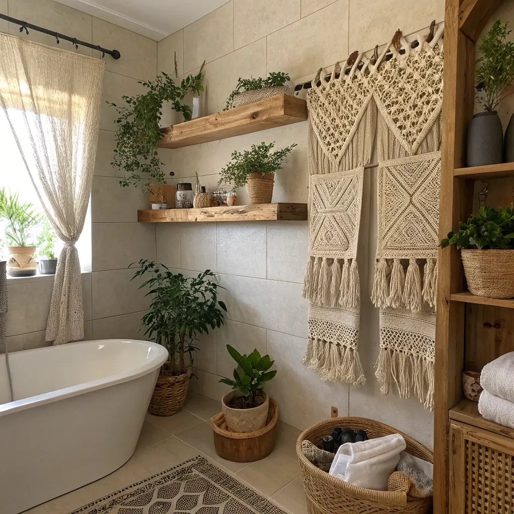 - Phase 2:ย Introduce plants, textiles (rugs, towels, shower curtain), and a macramรฉ accent