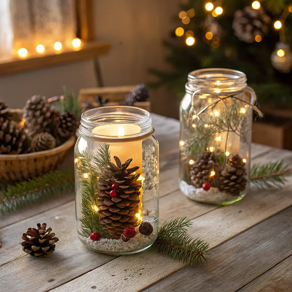 I make these every year, and they never get old. Wrap twine or thin rope around the jar’s neck, secure with hot glue, and add a small sprig of greenery or a mini pinecone. Drop in a battery-operated candle (real ones work too if you’re not paranoid about fires like I am), and you’re golden.