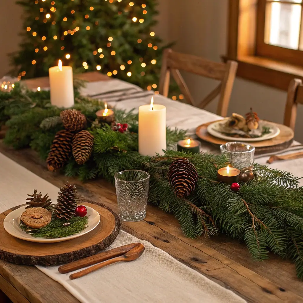 Forget fabric table runners. We’re going full forest floor here. A natural evergreen runner brings the outdoors in and makes your dining table feel like something out of a holiday magazine.