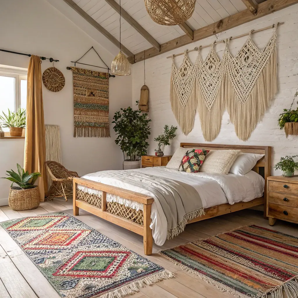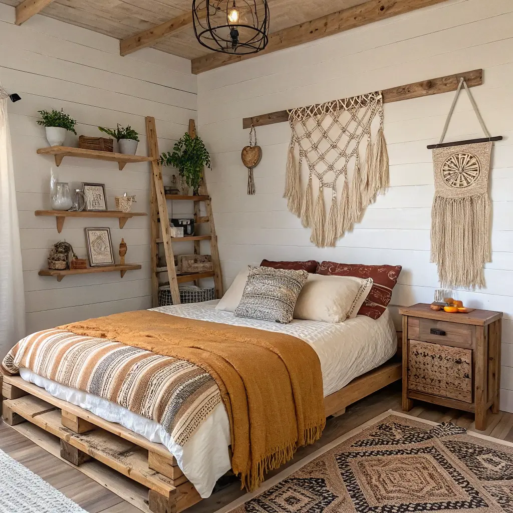 Layer, layer, layer—that’s your mantra here. Start with your rustic farmhouse base (wood furniture, neutral walls), then go wild with boho elements. Think macramé wall hangings, colorful vintage rugs, and plants everywhere. Seriously, you can’t have too many plants in a boho bedroom.
