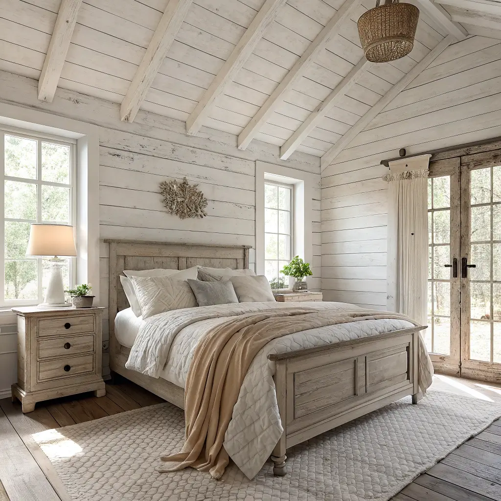 Pair your whitewashed elements with soft pastels or stick with an all-white palette for that dreamy, cloud-like bedroom feel. Add some vintage brass or copper accents for warmth, and you’ve nailed the elegant farmhouse look.