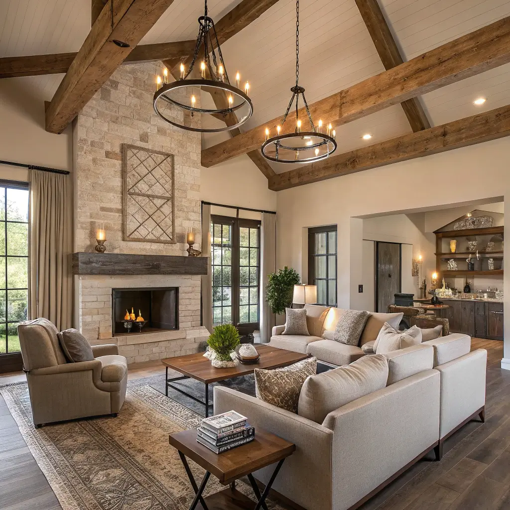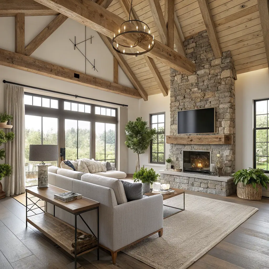 A stone fireplace instantly becomes the heart of any rustic farmhouse living room. Whether you’re working with real stone or a convincing veneer, this feature commands attention and sets the entire tone for your space.
