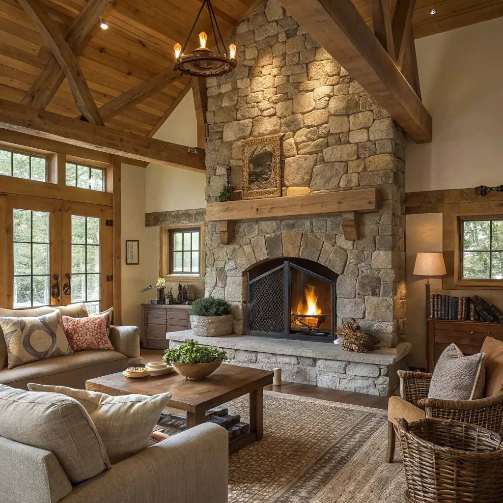 Rustic Farmhouse Living Room with Stone Fireplace