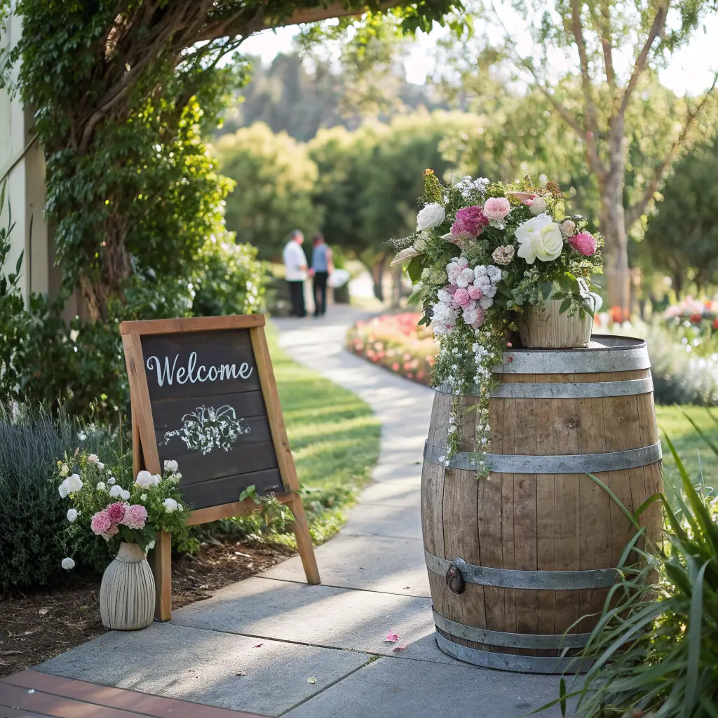Want to know the secret sauce? Position one barrel on each side of your entrance, add a weathered wooden board with your names and wedding date in beautiful calligraphy, and boom – instant charm. I personally love adding some cascading greenery or seasonal flowers spilling over the edges. Think about it – doesn’t that sound way better than those generic printed signs everyone forgets about?