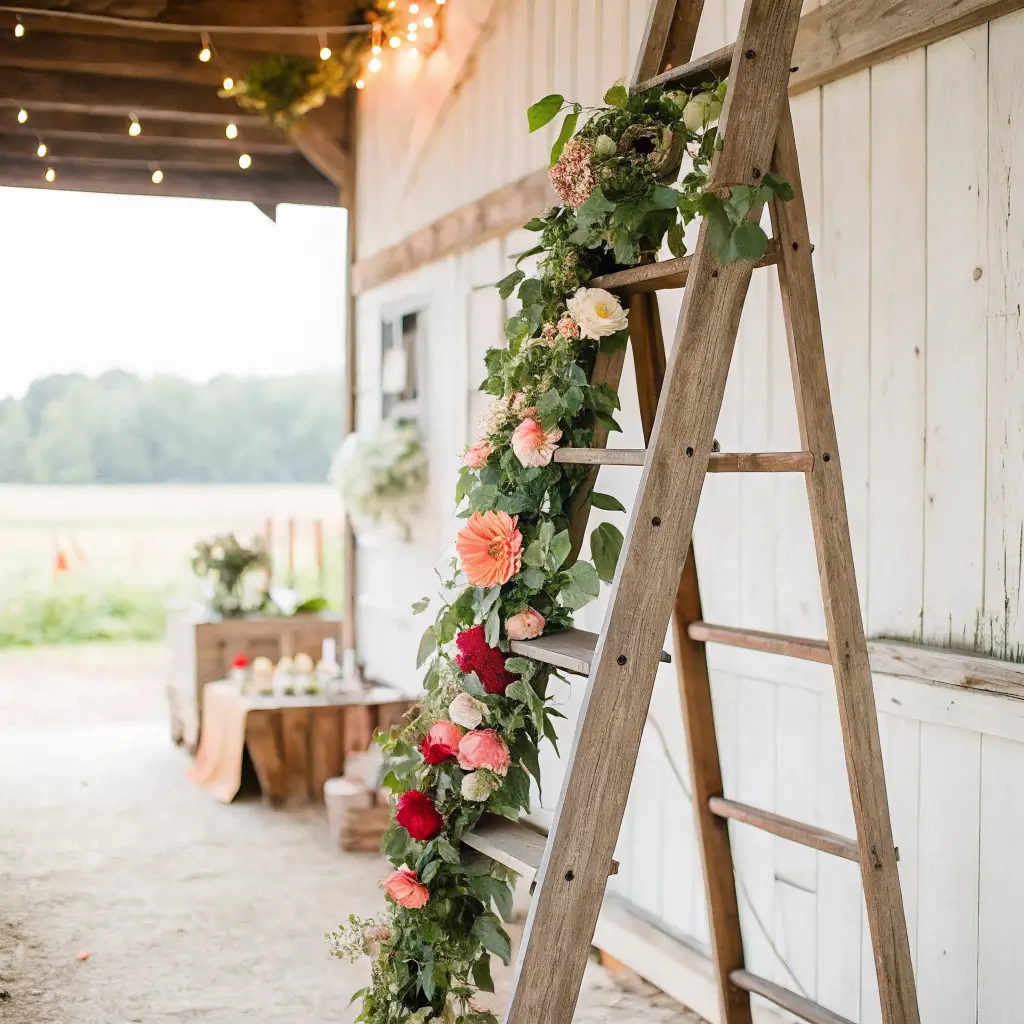 Picture this: a weathered wooden ladder, maybe six feet tall, leaning against a barn wall or standing freely with support. Now drape cascading greenery from each rung, tuck mason jars filled with wildflowers into the steps, and maybe hang some family photos or love notes between the rungs. Instant focal point that costs practically nothing if you already have the ladder.