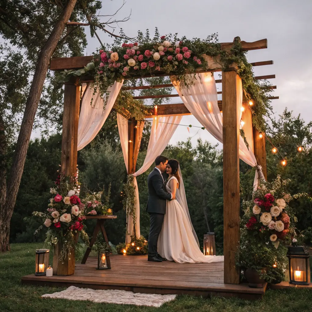 Drape flowing fabric asymmetrically for movement, weave greenery through the structure, and add strategic flower clusters at the corners or peak. Don’t feel like you need to cover every inch – sometimes the beauty of the wood itself deserves to shine through.