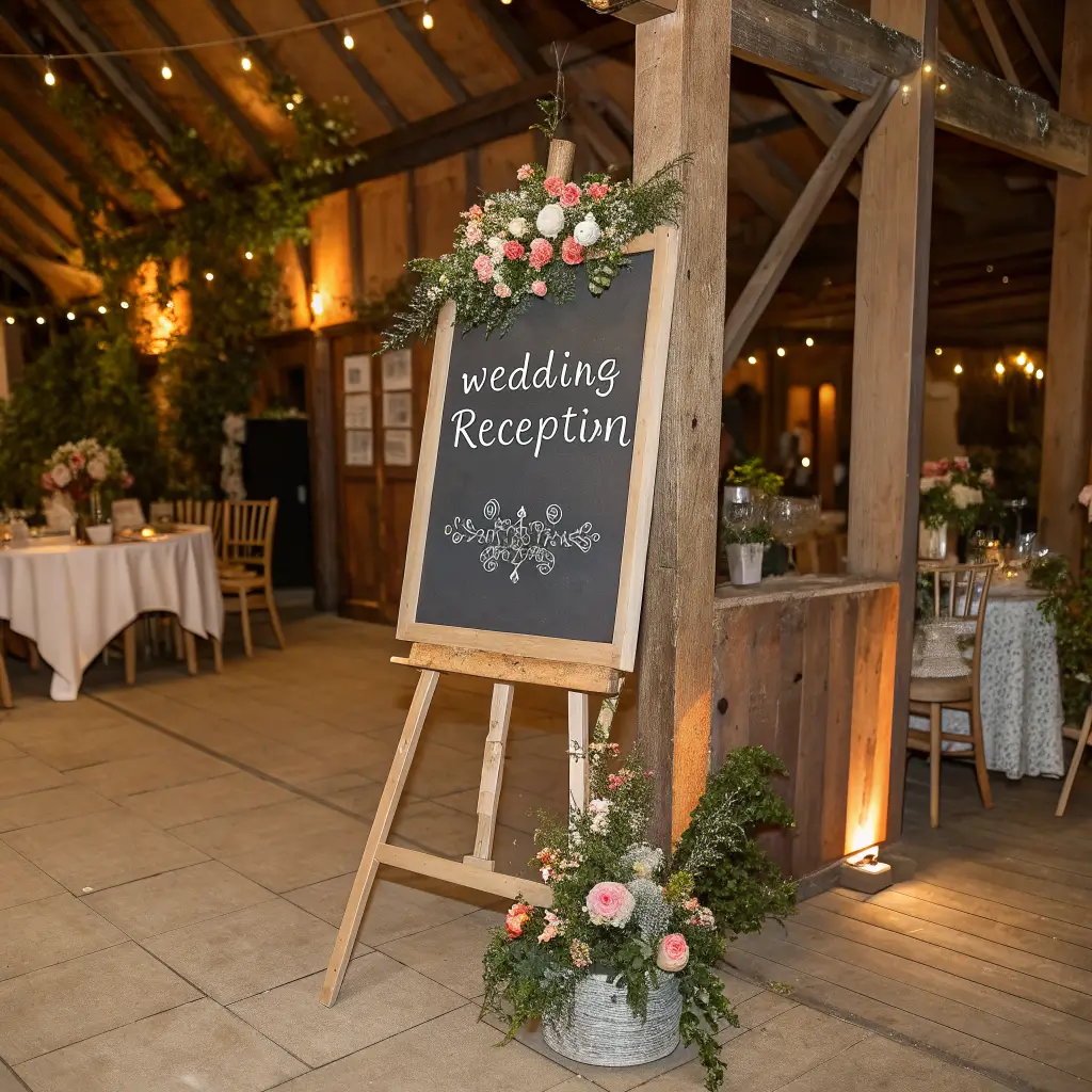 Large chalkboard signs listing your menu items become part of the decor itself. Position them near the entrance, by the bar, or even create individual chalkboard place cards for each table. The hand-lettered look adds that personal touch that makes guests feel like they’re at an intimate dinner party rather than a formal event.