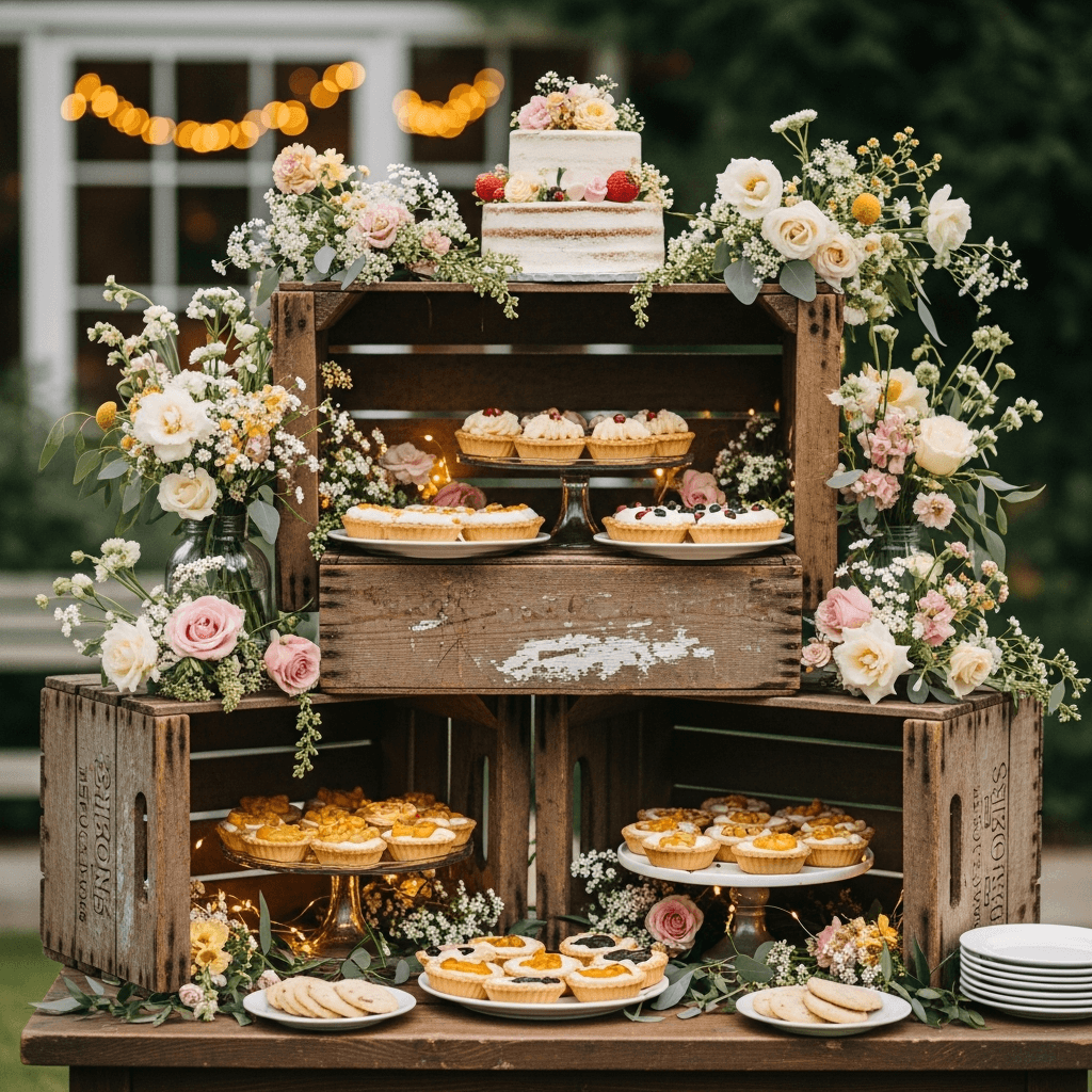 Fill the display with an assortment of treats – not just your wedding cake. Think pie bars, cookie stations, candy jars, maybe even a donut wall attached to one of the crates. Label everything with those cute little chalkboard signs, and watch your guests lose their minds taking photos before they even grab a treat.