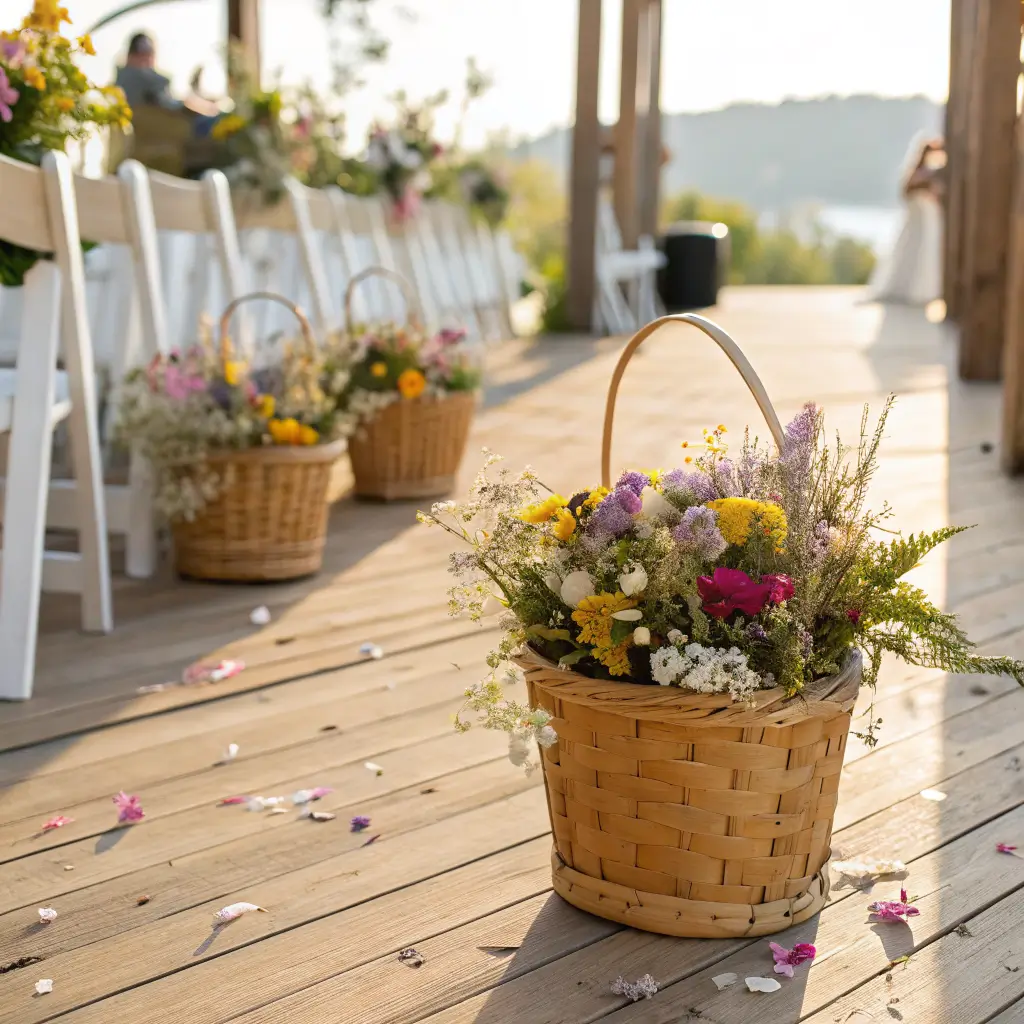 Last but definitely not least, let’s talk about those adorable wildflower toss baskets that make your petal-tossing game strong. Instead of those tragic paper cones or plastic baskets that scream “party store,” we’re going full rustic charm with woven baskets filled with locally sourced wildflowers and petals.