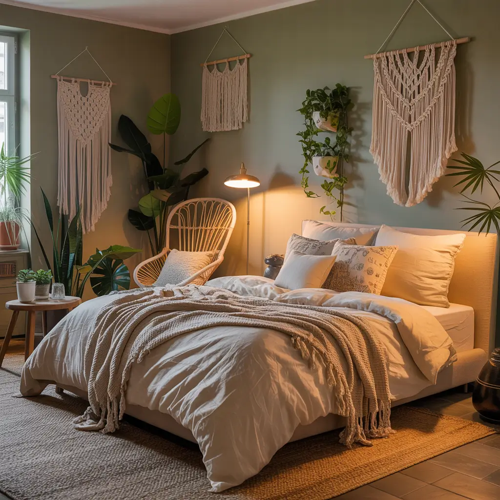 Layer, layer, layer – that’s the boho mantra. Start with cream walls, add sage green curtains, throw in some macrame wall hangings, and pile on the textured pillows. My boho bedroom has at least six different textures going on, and somehow it all works.