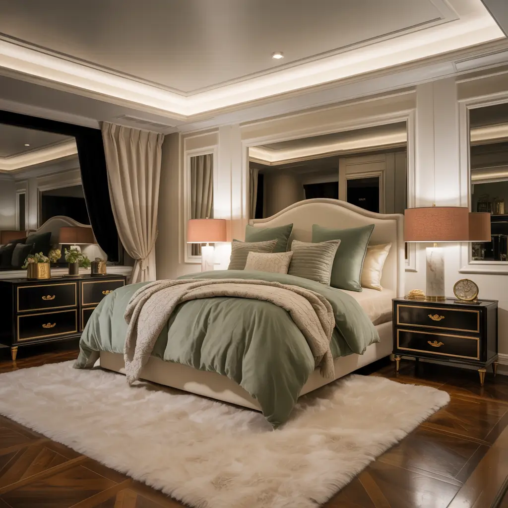 Luxury Bedroom with Sage Green Bedding and Cream Decor