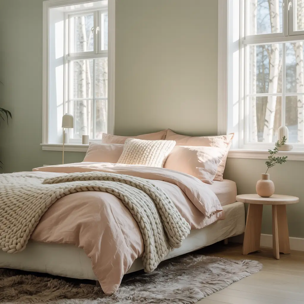 Natural materials are non-negotiable in Scandi design. Light wood furniture, woven baskets for storage, maybe a jute rug to add texture. The sage and pink elements should feel like they grew there naturally, not like they were forced into the space.
