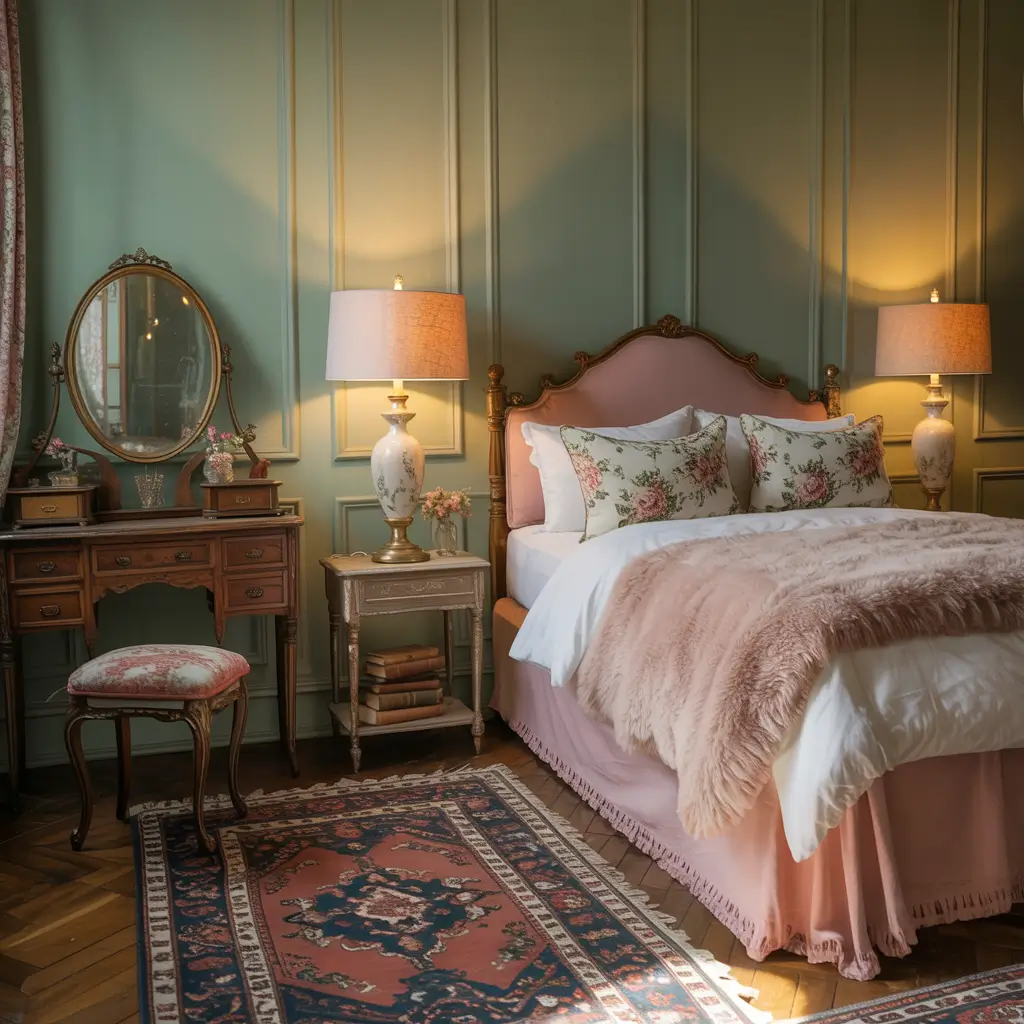 Start with quality over quantity. Invest in luxurious sage green silk or satin bedding that makes you feel fancy every single night. Add pink velvet pillows with subtle metallic threading. Choose furniture with curved lines and refined details – think French provincial meets modern elegance.