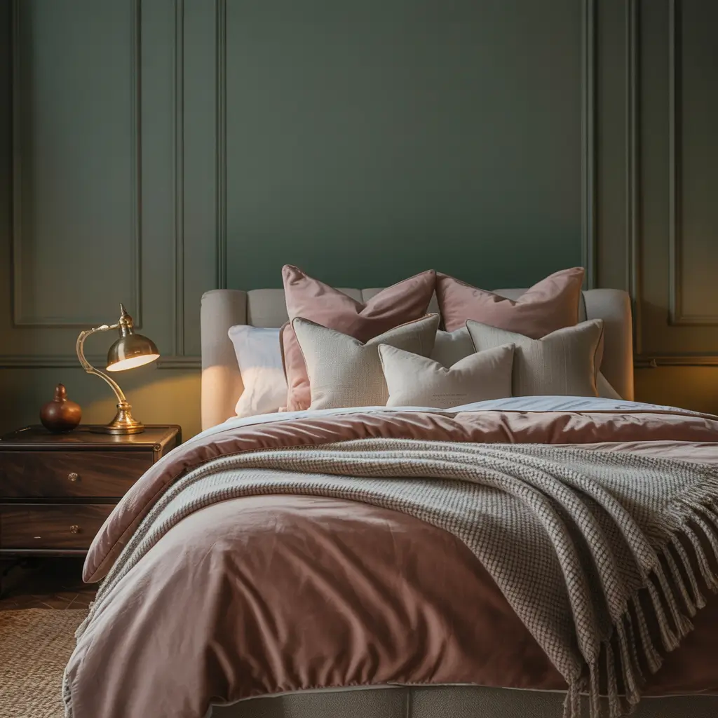 Textures need to be rich and luxurious. Think velvet, silk, and faux fur in your chosen colors. A sage green velvet duvet paired with pink silk pillowcases creates tactile interest that photographs beautifully and feels even better. Add some dark wood furniture and black metal accents to complete the moody vibe.