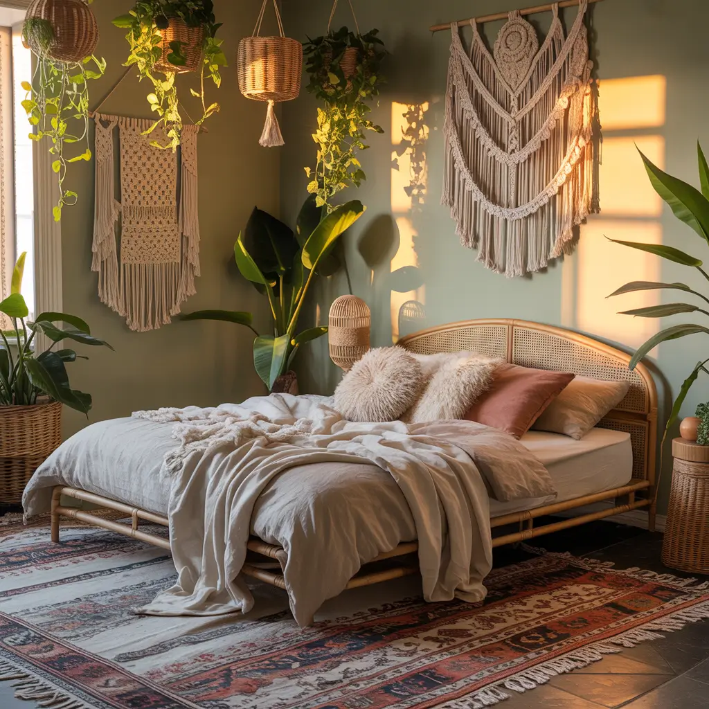 Don’t forget the essential boho elements: rattan furniture, floor cushions, string lights (because who doesn’t love twinkly lights?), and at least three different types of throw pillows. Oh, and plants. Did I mention plants? You need ALL the plants.