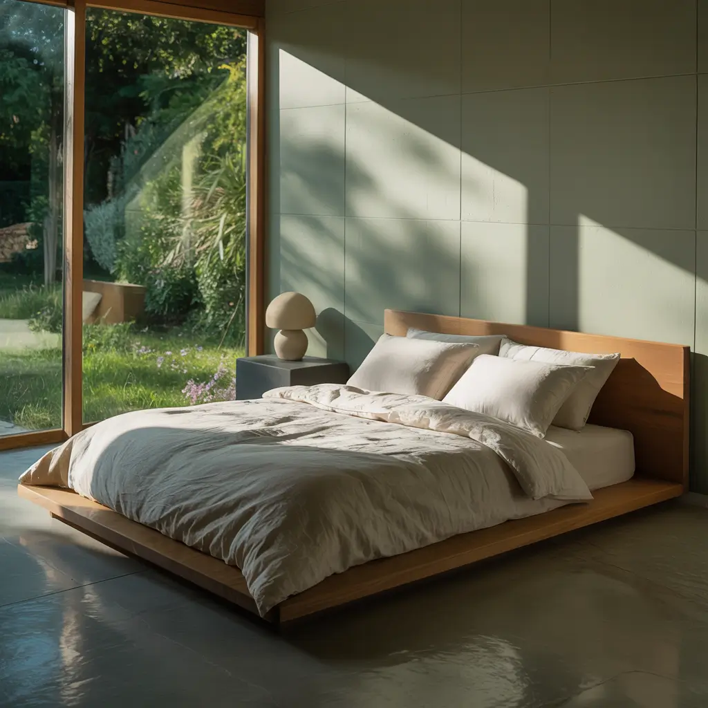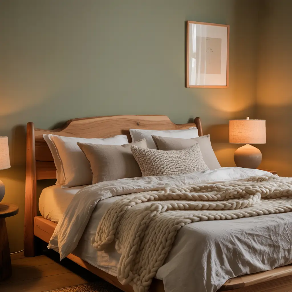 What really works is pairing sage green walls with crisp white bedding and natural wood furniture. I went with a light oak bed frame and matching nightstands, and the whole room just flows. You want to keep your color palette super tight here – we’re talking sage green, white, and maybe one natural wood tone. That’s it.