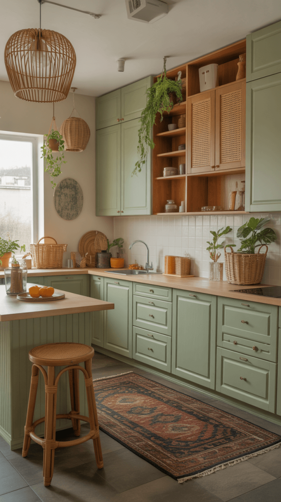 15. Boho Chic Kitchen with Sage Green and Rattan Decor