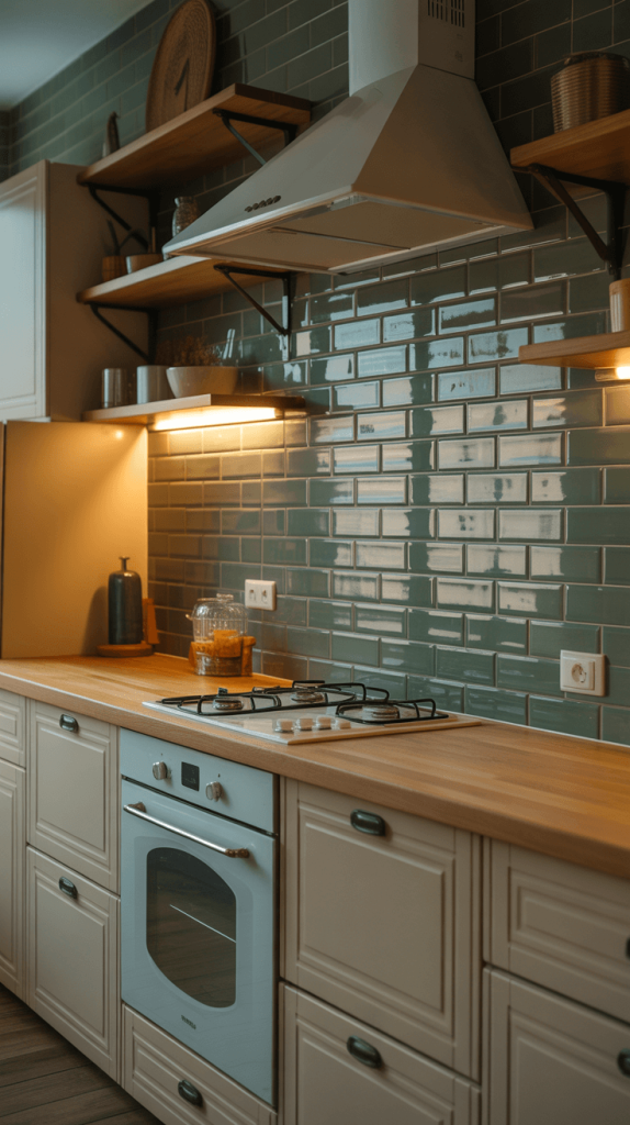 A green backsplash ties the room together and creates this incredible, cozy vibe, especially when paired with warm wood tones and soft lighting. It’s the design equivalent of a warm hug.