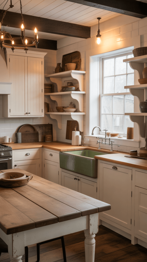 Instead of going all-in on green cabinets, try using sage as an accent. Picture this: creamy white Shaker cabinets, a big, beat-up farmhouse table as an island, open shelving with earthy pottery, and then—BAM—a gorgeous sage green farmhouse sink or a sage green range hood.