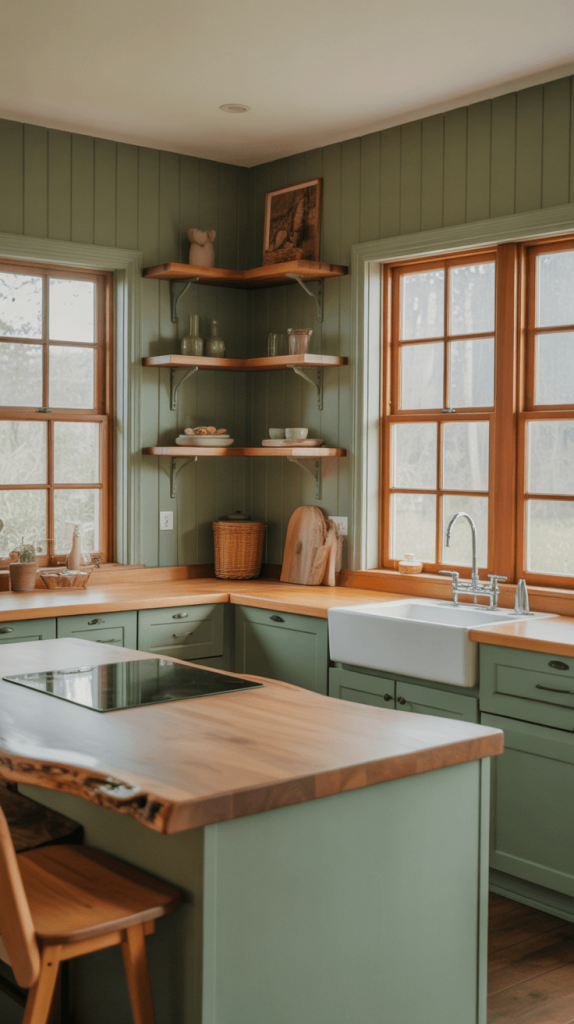 Love it or hate it, open shelving looks fantastic with sage green. By removing the upper cabinets, you prevent the color from feeling too overwhelming. You can paint the back wall of your shelves sage green, or have your lower cabinets in sage and your open shelves in a natural wood tone.