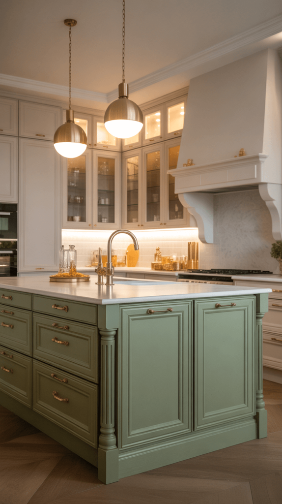 4. Sage Green Kitchen Island with Gold Hardware: The Showstopper