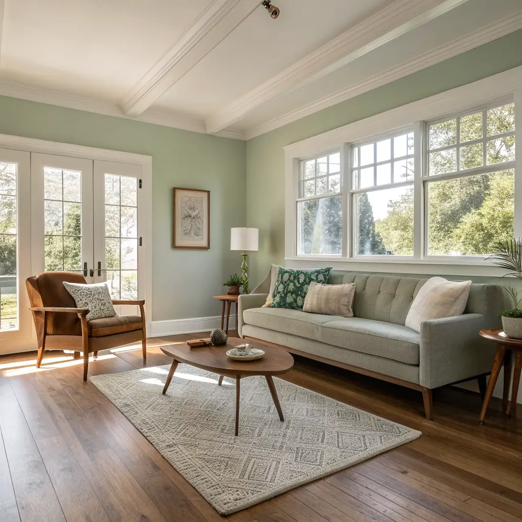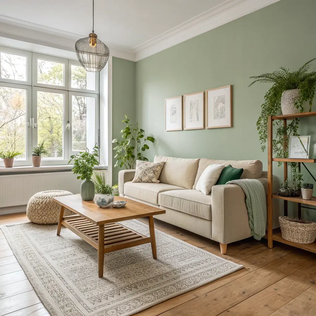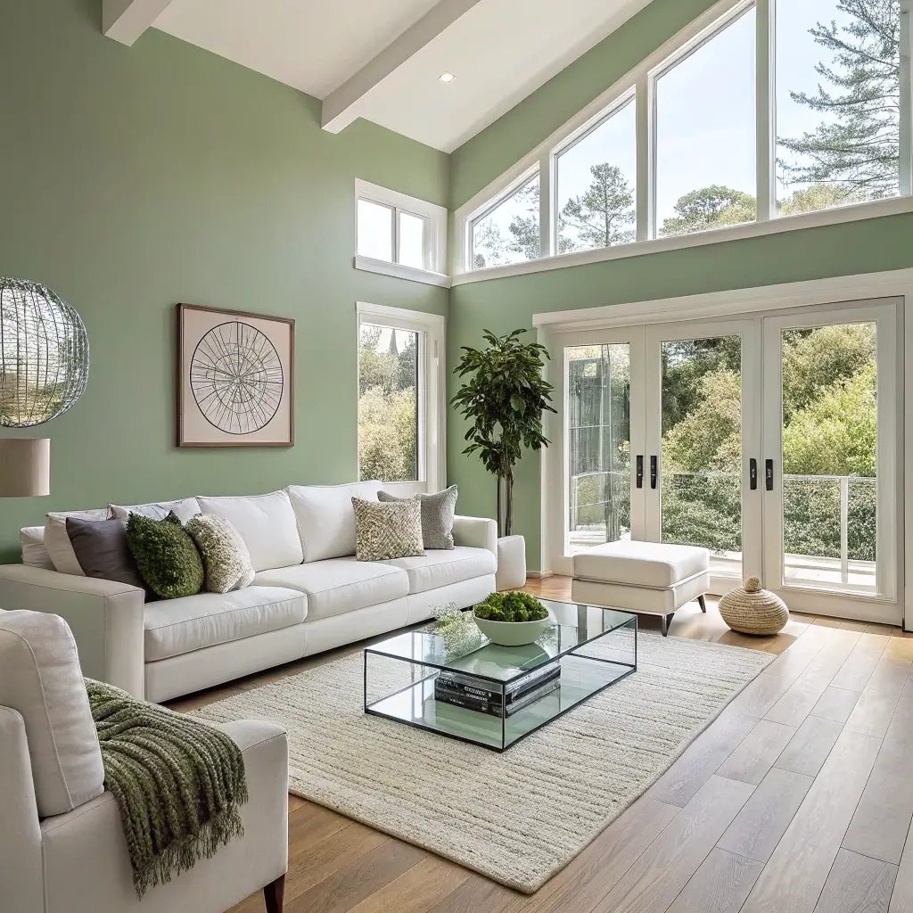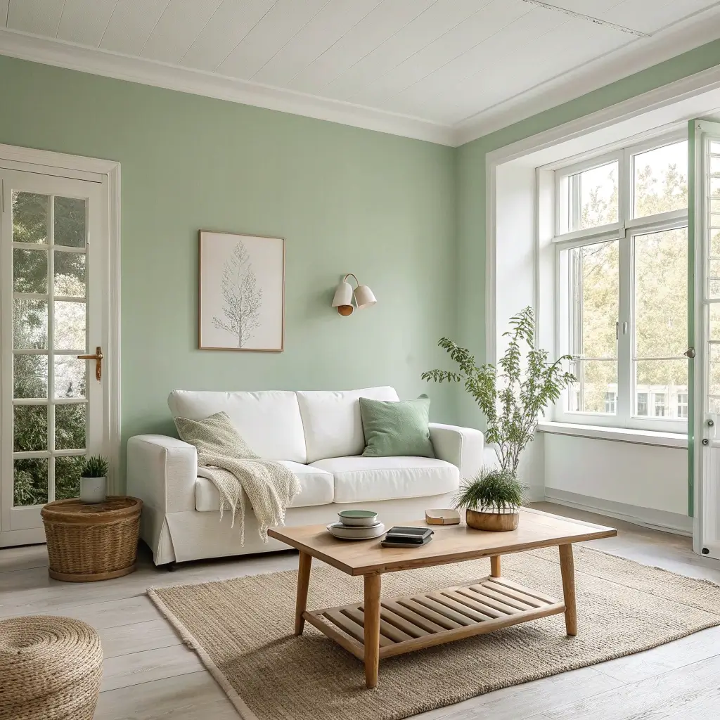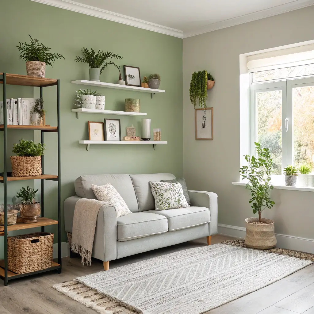Paint your largest wall sage – usually the one behind your sofa. This creates a focal point without closing in the space. Keep other walls light and bright to maintain that airy feeling.