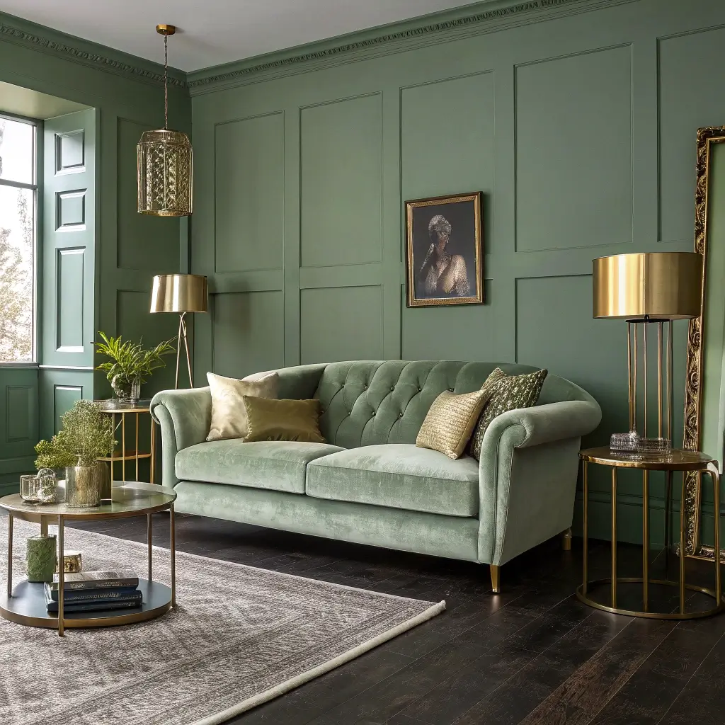 Consider adding a large mirror with a brass or gold frame. The reflection bounces light around while the metallic finish creates this gorgeous warm contrast against the cool sage. Plus, mirrors make your space look bigger – win-win situation right there.