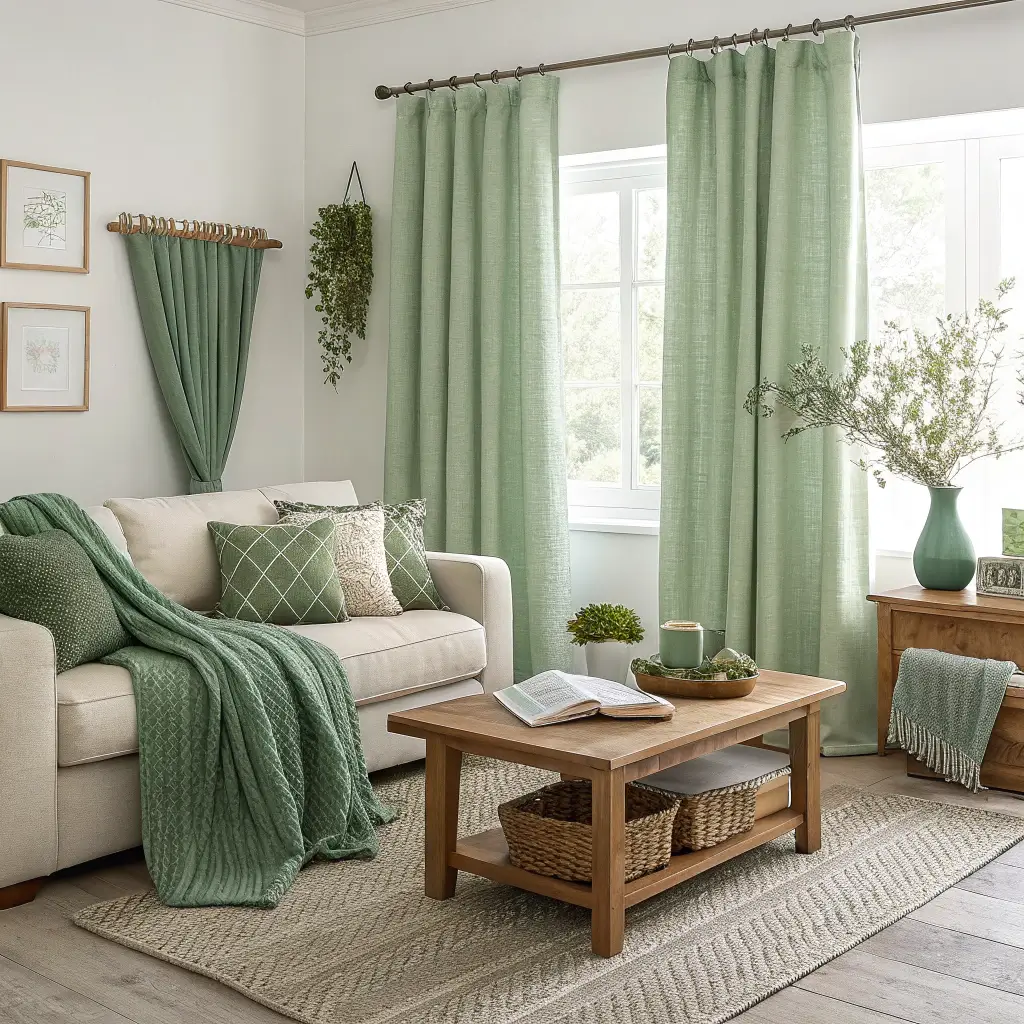 Mix textures to create interest. Combine sage linen curtains with velvet pillows and a chunky knit throw. Different textures in the same color family add depth without chaos.