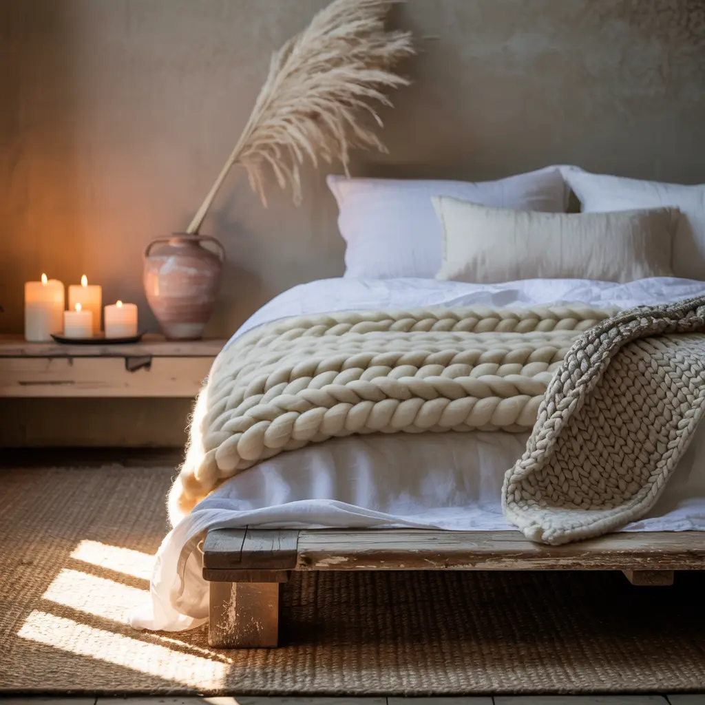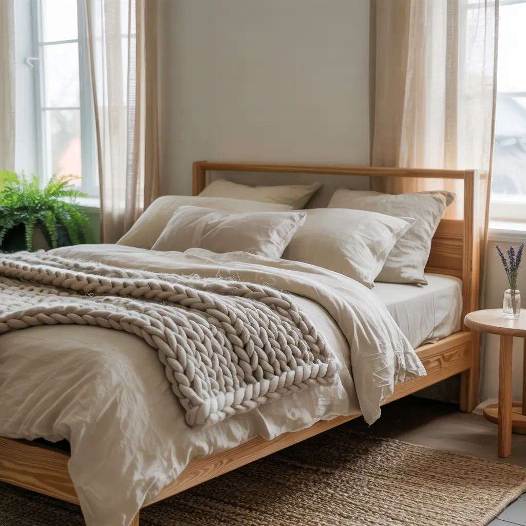 I learned this lesson when my first attempt at Scandinavian design left my bedroom feeling more like an Apple store than a sanctuary. Adding different textures completely transformed the space. We’re talking chunky knit blankets, linen sheets, sheepskin rugs, and woven baskets.