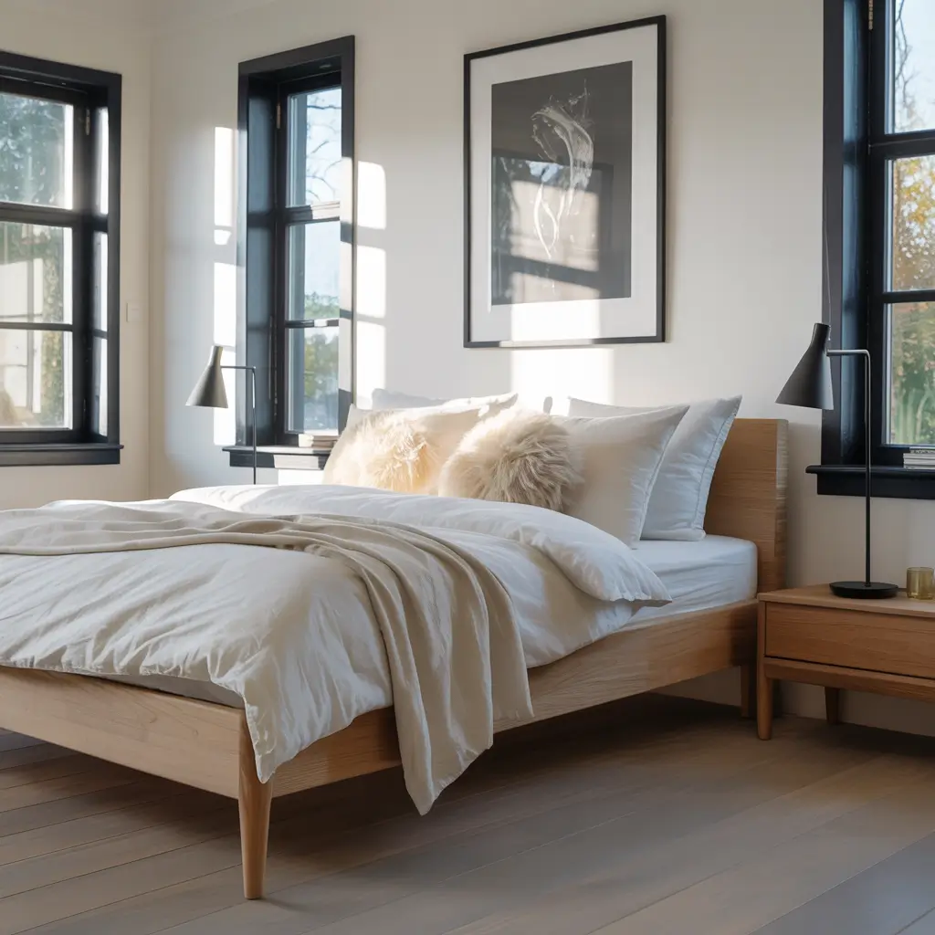 You want something simple and functional. Skip the ornate headboards and go for clean lines. Platform beds work brilliantly, or choose something with subtle Nordic-inspired details like tapered legs or a slatted headboard.